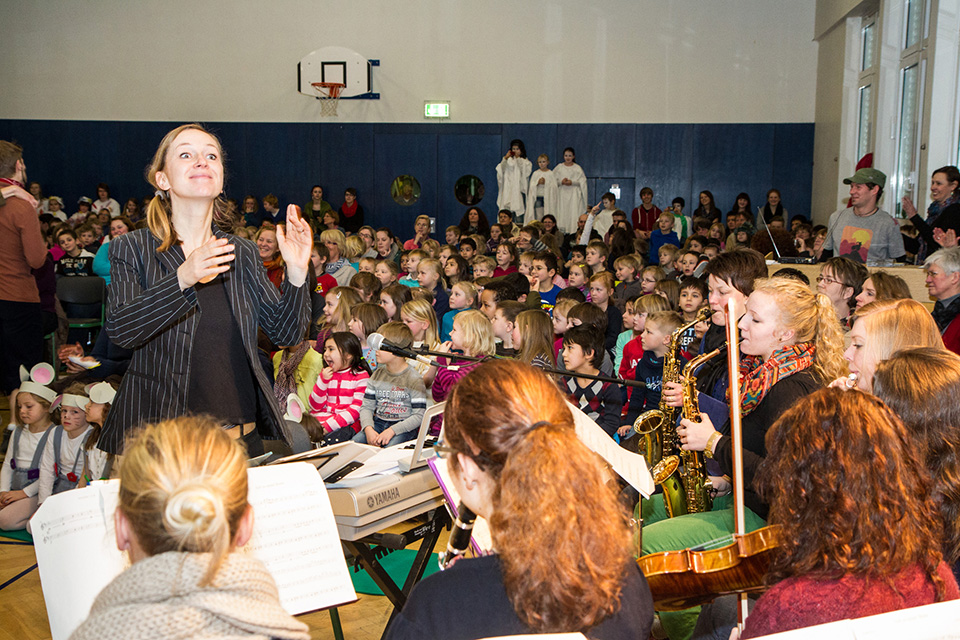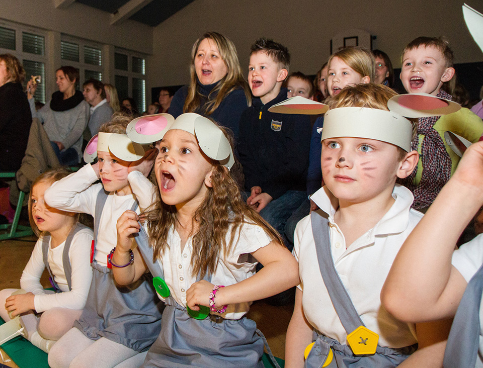 Was für eine Aufregung: Als sich die Bremer Stadtmusikanten vor dem Fenster der Räuber auftürmen, ergreifen die vor Schreck die Flucht. Insgesamt siebenmal führen die Studierenden der Fachschule für Sozialpädagogik und die Schülerinnen der Kinderpflege am Berufskolleg Bergkloster Bestwig mit zahlreichen Kindern benachbarter Kindergärten und Schulen in der Aula das Märchen auf.