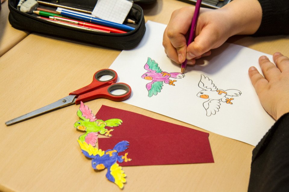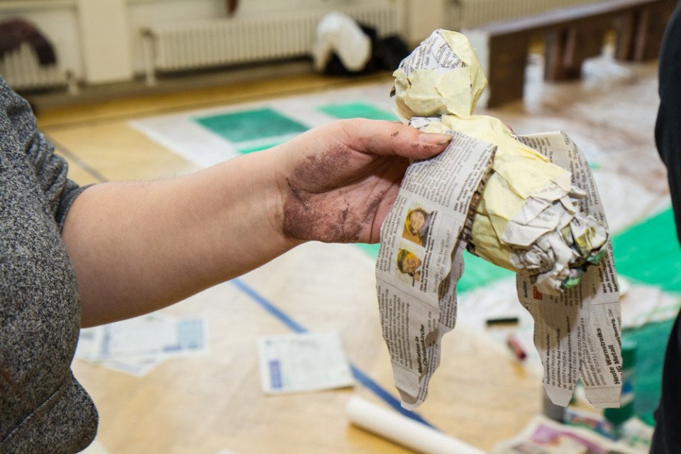 „Erst hatten wir überlegt, was wir für die verschiedenen Bühnenteile brau-chen: Vorbühne, Hauptbühne, Rahmen. Dann haben wir uns auf verschiedene Untergruppen aufgeteilt“, erklärt die angehende Erzieherin. Dabei gilt es natürlich, preiswerte Materialien zu nutzen. „Für die Mauern eigneten sich zum Beispiel die Hartschaum-Verpackungen unserer neuen digitalen Tafeln, die erst vor ein paar Wochen geliefert wurden“, erklärt die Auszubildende. Und wenn etwas fehlt, nehmen die Gruppenleitungen diese Wünsche mit zum Fixpunkt, wo sie sich gegenseitig über ihre Fortschritte informieren.