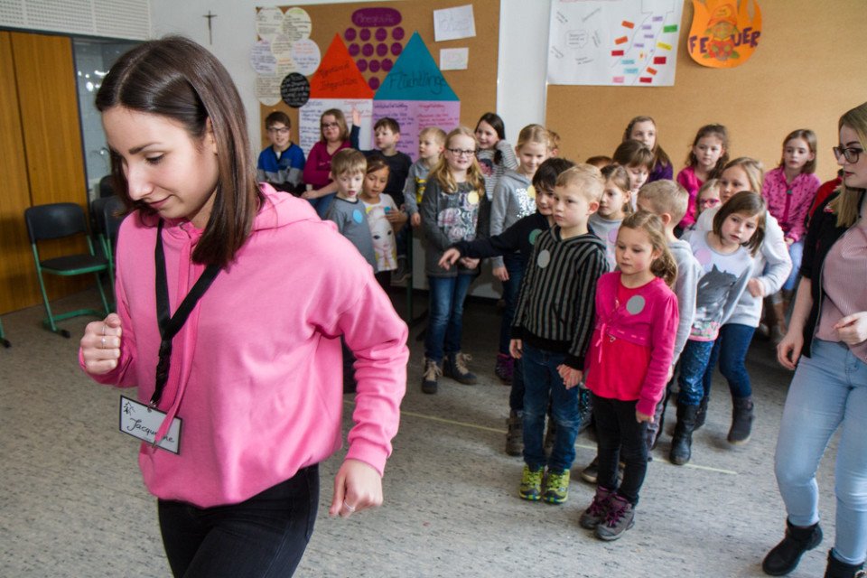 „Wir gehen erst einmal nebeneinander in zwei Rei-hen auf die Bühne. Und da bilden wir zwei Kreise“, beginnt sie ihre Erklärungen. Anschließend zeigt Jaqueline den Kindern genau, wie sie laufen müssen. Die Choreografie für den Tanz fängt dann eigentlich erst an – aber da müssen die ersten schon aufs Klo. Unterbrechung. „Ich habe bereits ein paar Praktika in Kindergärten absolviert. Aber mit 26 Kindern in zwei Stunden einen Tanz einzustudieren, ist schon eine besondere Herausforderung“, sagt die 20-jährige. Sie findet das spannend: „Da lernt man sich ja auch selbst besser kennen.“