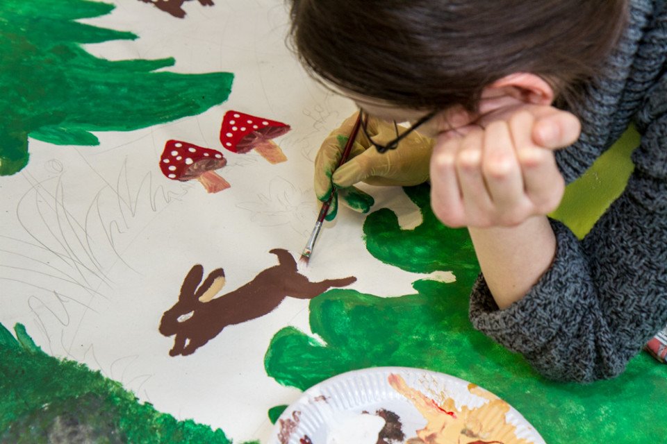 Viele der Schülerinnen und Schüler, die zu der Kulissengruppe gehören, haben sich in der großen Schul- und Sportaula einen Arbeitsplatz eingerichtet. Denise Bunse malt zum Beispiel mit brauner Farbe, breitem Pinsel und Schwamm die Schlossmauern an.