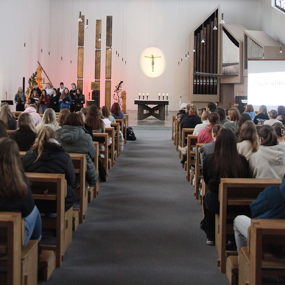 Impuls in der Klosterkirche Am 28. November erinnerte das Berufskolleg Bergkloster Bestwig an den Geburtstag seiner Gründerin Julie Postel. Aus diesem Anlass versammelten sich Schülerinnen und Schüler sowie Lehrkräftte zu einem kurzen Impuls in der Klosterkirche.