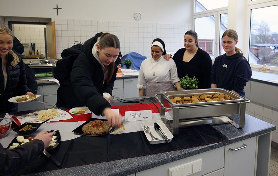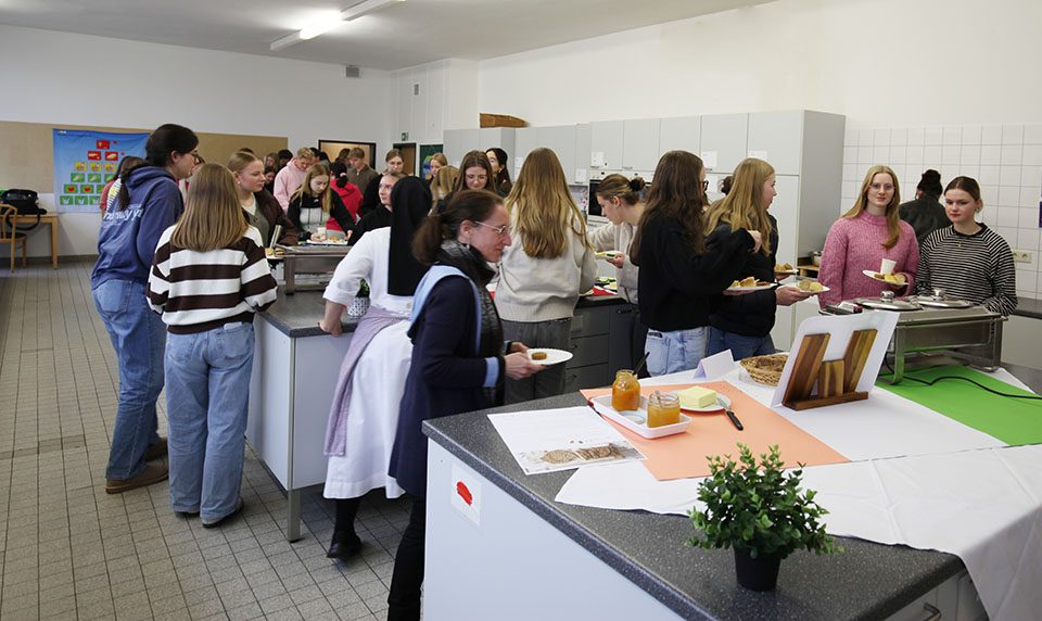 Im Anschluss an den Impuls in der Klosterkirche bereitete die Oberstufe der zweijährigen Berufsfachschule (B3O) ein besonderes Highlight vor: ein Weltfrühstück, das die Schülerinnen und Schüler mit viel Engagement und Kreativität gestalteten. Grundlage dafür waren die Länder, in denen die Schwestern der heiligen Maria Magdalena Postel tätig sind – und deren kulturelle Vielfalt sich in den ausgewählten Speisen widerspiegelte.