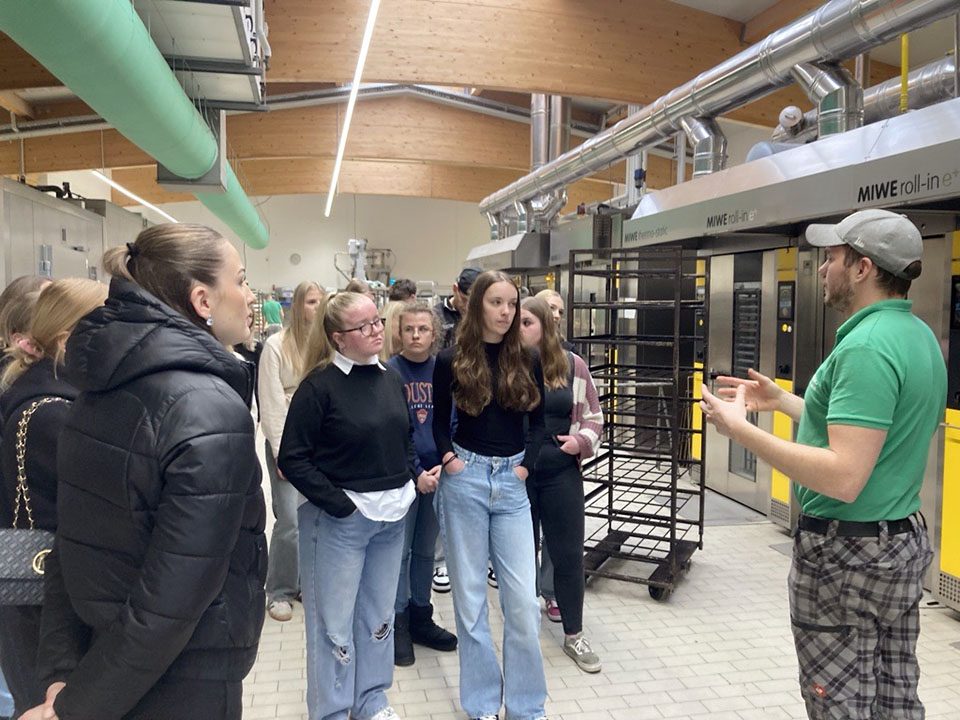 Nach intensiver theoretischer Auseinandersetzung mit Grundlagen der Ernährung und den Inhaltsstoffen verschiedener Lebensmittel hatten die Schülerinnen und Schüler die Gelegenheit, das theoretisch Erlernte in der Praxis zu erleben. Bei der Führung durch die Backstube konnten sie hautnah miterleben, wie Backwaren hergestellt werden – von der Auswahl der Zutaten über die Teigbereitung bis zum fertigen Produkt. Dabei erhielten sie interessante Einblicke in die Abläufe einer professionellen Backstube, die Bedeutung von Frische und Qualität sowie in die handwerklichen Prozesse, die hinter täglich frischen Broten, Brötchen, Kuchen und Gebäcken stehen.
