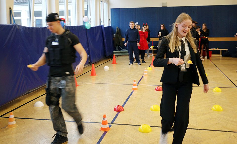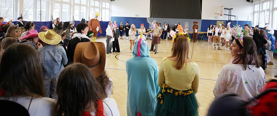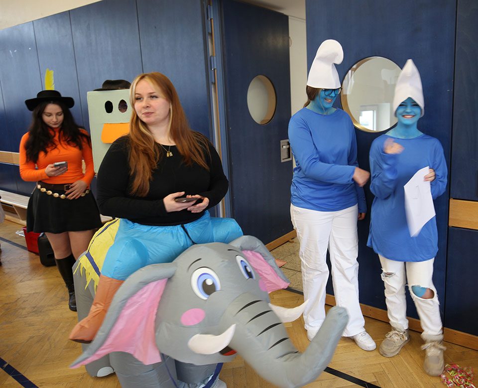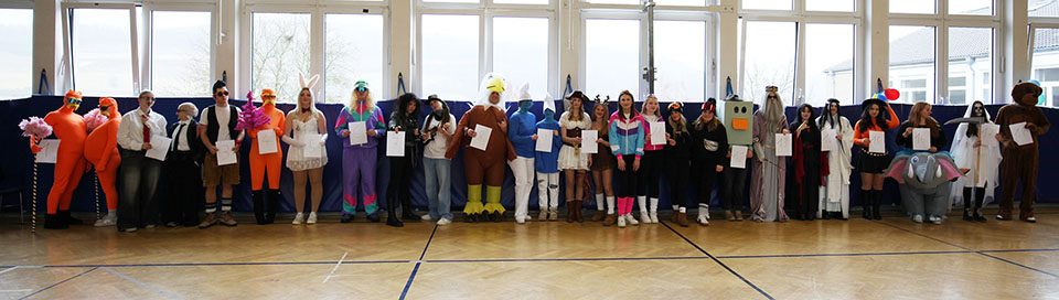 In der Sportaula trafen die die Klassen abwechselnd, um einen Spieleparcous zu druchlaufen. Eine große Polonaise durch die gesamte Schule mit Ermittlung der originellsten Kostüme bildete den letzten Programmpunkt für diesen Tag. Besonders der Wettbewerb sorgte für viele strahlende Gesichter, als die originellsten Verkleidungen prämiert wurden. Für das leibliche Wohl war ebenfalls gesorgt, sodass alle gestärkt weiterfeiern konnten.
